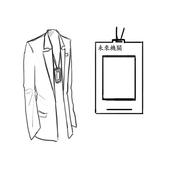 -왼쪽 가슴부근에 미래기관 로고가 있는 흰색 정장 마이