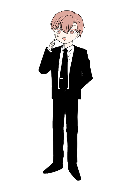 단정하게 검은색 정장을 차려입었으며 넥타이엔 미래기관 로고가 달린 넥타이 핀을 끼고있다.